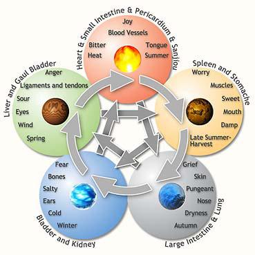 Chaque élément est également associé à une émotion, à des parties du corps, à un orifice du corps, à un sens, à une saveur, à une sensation et à une saison. Dans le diagramme si dessous, les flèches allant dans le sens des aiguilles d'une montre, démontrent comment les éléments agissent l'un sur l'autre et les uns avec les autres.