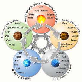 Comme toutes choses dans l'univers, le corps humain est influencé par les énergies de ces cinq éléments. Tous déséquilibres dans les énergies d'un élément se répercuteront dans les organes et les méridiens dominés par cet élément.
